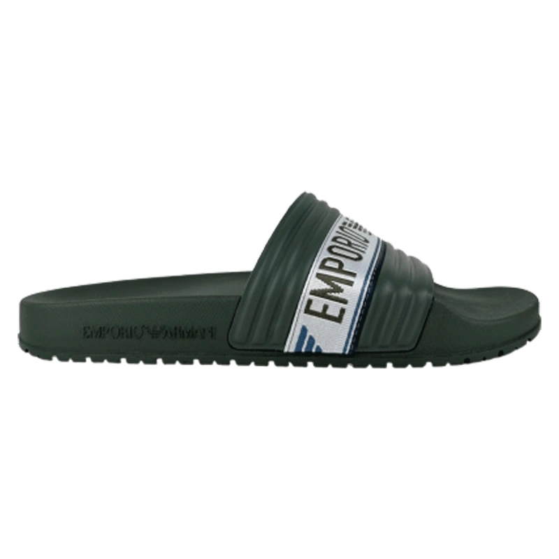 Claquettes kaki de la marque Emporio Armani. Sur la lanière, se trouve le logo Eagle en kaki avec un fond blanc et un liseré bleu et un autre bleu marine. Semelle ergonomique en caoutchouc pour un meilleur confort. Sur le côté extérieur des claquettes se trouve le nom de marque Emporio Armani.