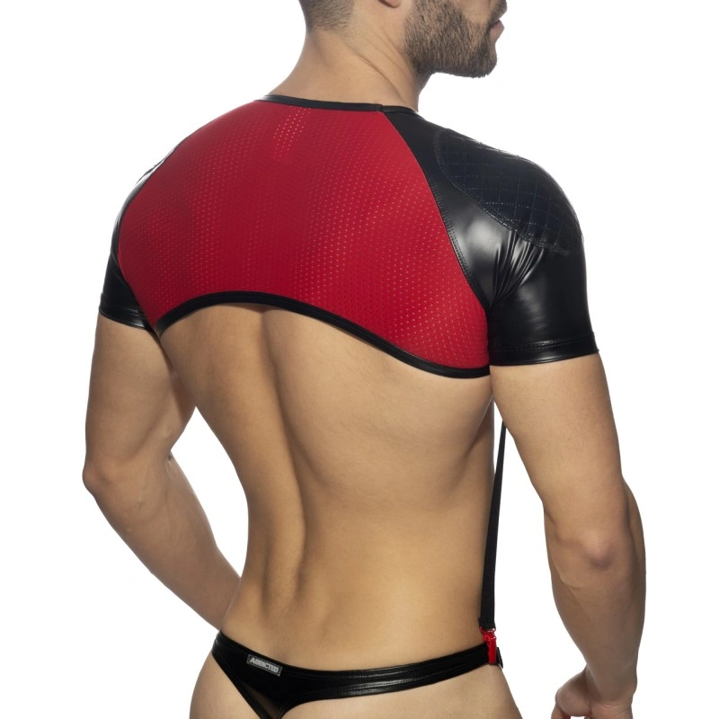 Crop Top ADDICTED en mesh rouge et empiècements effet matelassé et cuir noir.