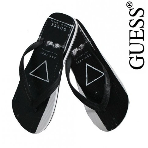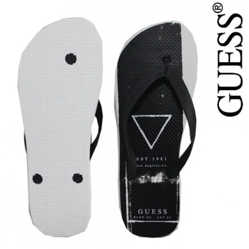 Claquette / tong GUESS. La fameuse flip flop basic simple, ergonomique et très tendance avec le logo GUESS la lanière. Elle s’harmonise parfaitement avec une tenue d’été de type lin.