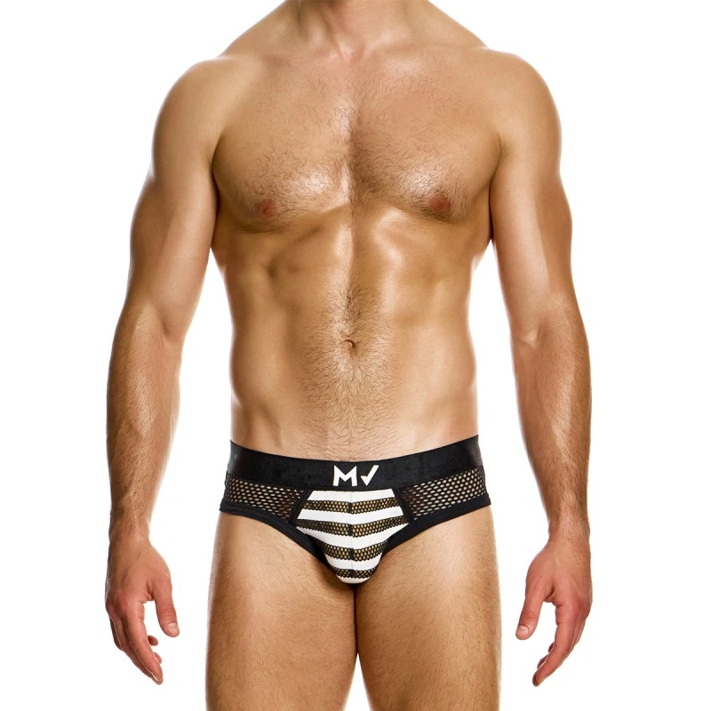 L’avant du slip est à rayures noir et blanc, l’arrière et les côtés sont noirs en crochet (Cf photos)