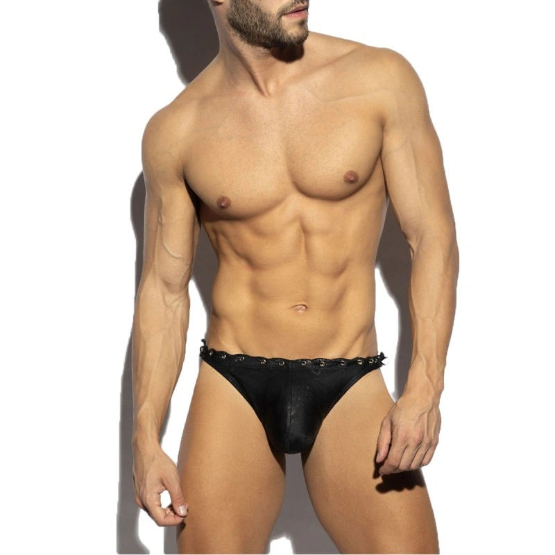 Slip de bain ES collection noir en tissu fin, tissu principal laminé avec un matériau qui simule un effet peau d’un serpent. À l’arrière nous retrouvons le logo ES Collection sur une épingle en acier inoxydable